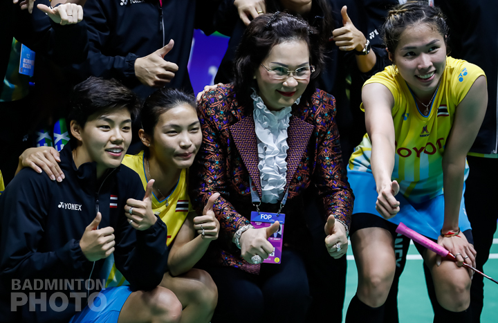 Członkowie BWF na wiceprezes organizacji wybrali pochodzącą z Tajlandii byłą zawodniczkę Khunying Patama Leeswadtrakul (na fot. z żeńską częścią drużyny Tajlandii po wygranym ćwierćfinale z Koreą). W głosowaniu większościowym pokonała mocnego kontrkandydata z Chin — prezesa chińskiego związku badmintona, Zhang Juna. 54-letnia Leeswadtrakul zasiada obecnie w Zarządzie BWF i jest członkinią Międzynarodowego Komitetu Olimpijskiego. Będzie przewodniczyć w roli wiceprezesa BWF przez dwuletnią kadencję 2019-2021. W przemówieniu zapewniła m.in. o chęci zwiększenia różnorodności, zasięgu i dostępności badmintona, w tym również do zainicjowanego ostatnio airbadmintona. Podczas zgromadzenia wybrano także nowego członka rady BWF — Kinjiego Zeniyę z Japonii. Fot. Mikael Ropars (BadmintonPhoto, live) ap |