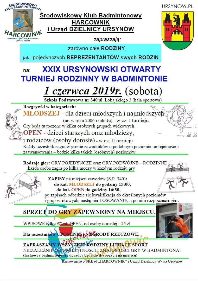 Ursynowski Otwarty Turniej Rodzinny odbędzie się w Warszawie w sobotnie popołudnie 1 czerwca 2019 w hali sportowej SP 340 na Natolinie przy ul. Lokajskiego 3.