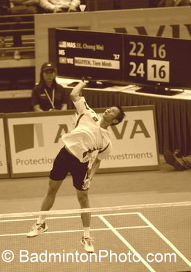 11.06.2009. Pod koniec trzeciego dnia otwartych mistrzostw Singapuru doszło do dwóch megasensacji w singlu mężczyzn. Najpierw lider rankingu światowego Malezyjczyk Lee Chong Wei, grający niemal na własnym terenie i mający wsparcie tłumu kibiców, napotkał zbyt silny opór ze strony 26-letniego Wietnamczyka Nguyen Tien Minha (fot. 1., *11 BWF). W pierwszej partii Wietnamczyk wykorzystał czwartą lotkę setową, broniąc w międzyczasie jednego setbola. W drugiej wydawało się, że nie będzie trzeciego seta, ale Lee obronił dwie lotki meczowe i wyrównał na 1:1. W decydującej odsłonie Malezyjczyk prowadził już 15:10 i 18:16, by po ponadgodzinnym pojedynku przegrać do 19. Znany komentator badmintonowy Raphael Sachetat żartował, że gdyby Nguyen był aktorem, to na pewno zdobyłby na festiwalu w Cannes Palmę za największego ducha walki.
