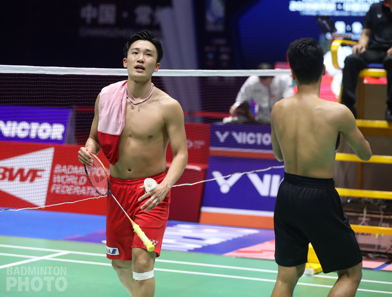 Ginting wygrywał w przeszłości trzykrotnie z Momotą, ale częściej było odwrotnie. Tym razem Indonezyjczyk utrzymał dobrą formę widoczną podczas całego turnieju, dzięki czemu spotkanie było bardzo wyrównane. Jedynie pod koniec trzeciego seta Ginting wezwał pomoc medyczną, po której zresztą odrobił stratę do rywala, wyciągając na 19:19. Jednak już przy pierwszej lotce meczowej dla mistrza świata Ginting w banalny sposób wpakował return w siatkę. Był to najdłuższy finał mistrzostw — równo 1,5 godz. Momota po raz pierwszy wygrał China Open, w którym najbliżej wygranej był rok temu, kiedy dopiero w finale przegrał właśnie z Gintingiem (zob. Kto ugrał w Chinach wielkiego szlema?). Zob. mecz na YouTube.