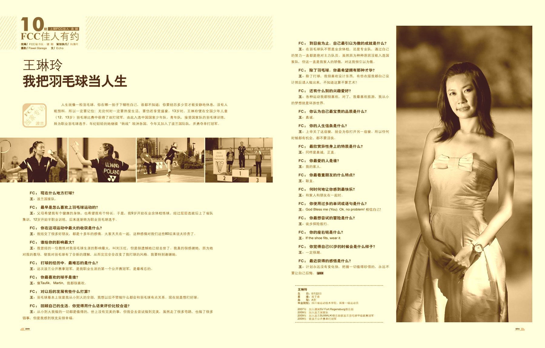 22.01.2010. Jak informowaliśmy pod koniec roku 2009 (zob. Linling znaczy piękna), w chińskim magazynie "First Classs" ukazał się wywiad z Wang Linling. Na jego potrzeby grająca w polskich barwach badmintonistka wzięła udział w specjalnej sesji fotograficznej, zaaranżowanej w ogrodach Wilanowa przez Pawła Staręgę. Choć osoby nie znające języka chińskiego wyłapią w materiale zaledwie kilka zrozumiałych słów (np. Pawel Starega czy Suwalki), zachęcamy do obejrzenia zdjęcia pięknej Linling w stroju godnym królewskich włości.