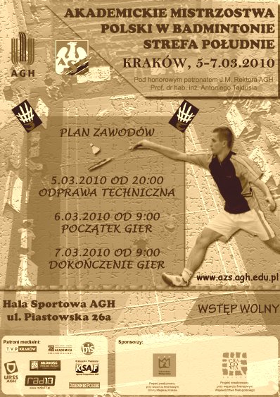 7.03.2010. Reprezentacje 17 uczelni rywalizowały w półfinale "Południe" (strefa B — z województw: świętokrzyskiego, podkarpackiego, małopolskiego, śląskiego, opolskiego, dolnośląskiego, wielkopolskiego i lubuskiego). W meczu o 1. miejsce AWF Kraków pokonała AWF Wrocław 4:3. Wcześniej krakowianie pokonali AWF Katowice 4:1, a wrocławianie wygrali z gospodarzami z AGH Kraków 4:3. Najciekawsze wyniki spotkań fazy grupowej Politechnika Wrocławska — AWF Wrocław 4:3 Beata Korkuś — Maja Muszyńska 9:21 13:21, , Marek Wojnarski — Marcin Ociepa 17:21 19:21, Korkuś/ Emilia Goldwasser — Magdalena Kamińska/ Aleksandra Witkowska 21:9 21:6, Kamil Kotecki/ Wojnarski — Ociepa/ Tymoteusz Czysz 13:21 21:18 23:21, Kamil Sawicki/ Zofia Pilch — Adam Sowa/Muszyńska 8:21 12:21, Goldwasser — Kamińska 21:13 21:18, Kotecki — Czysz 21:15 21:8. Politechnika Opolska — AWF Kraków 7:0 Daria Hołodnik — Paulina Bebynek-Bielańska 21:0 21:0, Krzysztof Kaczor — Hubert Pączek 21:0 21:0, Hołodnik/ Klaudyna Zarówna — Kamila Sagan/ Diana Polewczak 21:0 21:0, Kasjan Bieniasz/ Mateusz Bieniasz — Pączek/ Bartosz Pietryja 21:0 21:0, Zarówna/Kaczor — Dariusz Janik/ Sagan 21:0 21:0, Daria Siuda — Polewczak 21:0 21:0, K. Bieniasz — Janik 21:0 21:0. Wyniki spotkań ćwierćfinałowych AWF Kraków — Politechnika Wrocławska 4:0 Diana Polewczak — Beata Korkuś 24:22 21:11, Hubert Pączek — Kamil Sawicki 21:6 21:1, Polewczak/ Kamila Sagan — Korkuś/ Zofia Pilch 21:4 21:4, Pączek/ Bartosz Pietryja — Marek Wojnarski/ Kamil Kotecki 21:12 21:9, Dariusz Janik/ Sagan — Kotecki/ Emilia Goldwasser, Paulina Bebynek-Bielańska — Goldwasser i Janik — Wojnarski — nie rozgrywano. AWF Wrocław — Politechnika Opolska 4:0 Maja Muszyńska — Daria Hołodnik 21:6 21:11, , Marcin Ociepa — Krzysztof Kaczor 21:8 21:14, Magdalena Kamińska/ Aleksandra Witkowska — Hołodnik/ Klaudyna Zarówna 21:19 21:16, Ociepa/ Adam Sowa — Kasjan Bieniasz/ Kaczor 21:14 19:21 25:23, Sowa/Muszyńska — Mateusz Bieniasz/ Zarówna, Magdalena Kamińska — Daria Siuda i Tymoteusz Czysz — K. Bieniasz — nie rozgrywano. AWF Katowice — Politechnika Krakowska 4:1 Beata Ziółkowska — Magdalena German 21:2 21:0, Dawid JaŹwic — Dawid Miszczyszyn 21:13 16:21 21:13, Agnieszka Kaps/ Beata Ziółkowska — German/ Katarzyna Rygał 21:3 21:2, Michał Stebnicki/ Maciej Matuszewski — Paweł Zaucha/ Karol Garłacz 18:21 20:22, JaŹwic/ Bożena Wołkowycka — Miszczyszyn/Rygał 21:13 21:13, Joanna Tomża — Marta Rachwał i Stebnicki — Garłacz — nie rozgrywano. AGH Kraków — Uniwersytet Wrocławski 4:0 Ewelina Łach Justyna Machalska 21:7 21:6, Robert Gałek — Tomasz Grzebyk 21:10 21:8, Karolina Neska/ Katarzyna Płonka — Alicja Żuraw/ Machalska 21:11 21:10, Kornel Apostolik/ Tomasz Urbanik — Maciej Toczek/ Michał Jadczyk 21:9 21:10, Apostolik/Łach — Grzebyk/ Katarzyna Kowal, Płonka — Agnieszka Rydlewska i Urbanik — Jadczyk — nie rozgrywano. Wyniki spotkań półfinałowych AWF Kraków — AWF Katowice 4:1 Paulina Bebynek-Bielańska — Beata Ziółkowska 5:21 2:21, Hubert Pączek — Maciej Matuszewski 21:9 21:12, Kamila Sagan/ Diana Polewczak — Ziółkowska/ Bożena Wołkowycka 14:21 21:19 21:19, Pączek/ Bartosz Pietryja — Michał Stebnicki/ Dawid JaŹwic 21:11 21:15, Dariusz Janik/ Sagan — Stebnicki/Wołkowycka 21:15 21:14, Polewczak — Agnieszka Kaps i Janik — JaŹwic — nie rozgrywano. AWF Wrocław — AGH Kraków 4:3 Magdalena Kamińska — Ewelina Łach 12:21 14:21, Marcin Ociepa — Kornel Apostolik 21:19 21:12, Kamińska/ Maja Muszyńska — Karolina Neska/ Katarzyna Płonka 19:21 19:21, Ociepa/ Adam Sowa — Robert Gałek/ Tomasz Urbanik 21:12 21:11, Sowa/Muszyńska — Apostolik/Łach 21:16 21:19, Aleksandra Witkowska — Płonka 6:21 5:21, Tymoteusz Czysz — Gałek 21:13 23:21. Wynik spotkania o III miejsce AGH Kraków — AWF Katowice 4:1 Katarzyna Płonka — Beata Ziółkowska 21:8 21:10, Robert Gałek — Michał Stebnicki 10:21 17:21, Ewelina Łach/ Karolina Neska — Agnieszka Kaps/ Ziółkowska 21:18 21:13, Kornel Apostolik/ Gałek — Michał Stebnicki/ Dawid Jaźwic 21:15 21:14, Apostolik/ Łach — Jaźwic/Kaps 21:6 21:10, Neska — Joanna Tomża i Tomasz Urbanik — Maciej Matuszewski — nie rozgrywano. Wynik spotkania finałowego AWF Kraków — AWF Wrocław 4:3 Paulina Bebynek-Bielańska — Magdalena Kamińska 3:21 2:21, Hubert Pączek — Marcin Ociepa 21:10 21:10, Kamila Sagan/ Diana Polewczak — Kamińska/ Maja Muszyńska 18:21 16:21, Pączek/ Bartosz Pietryja — Ociepa/ Adam Sowa 17:21 21:18 21:16, Dariusz Janik/ Sagan — Muszyńska/Sowa 0:21 0:21, Polewczak — Aleksandra Witkowska 21:3 21:4, Janik — Tymoteusz Czysz 21:4 21:13. Końcowa kolejność jest następująca: 1. Akademia Wychowania Fizycznego, Kraków, 2. Akademia Wychowania Fizycznego, Wrocław, 3. Akademia Górniczo-Hutnicza, Kraków, 4. Akademia Wychowania Fizycznego, Katowice, 5. Politechnika Wrocławska, 6. Politechnika Opolska, 7. Politechnika Krakowska, 8. Uniwersytet Wrocławski, 9. Uniwersytet Marii Curie Skłodowskiej, Lublin, 10. Uniwersytet Ekonomiczny, Wrocław, 11. Uniwersytet Śląski, Katowice, 12. Politechnika Śląska, Gliwice, 13. Uniwersytet Jagielloński, Kraków, 14. Uniwersytet Ekonomiczny, Kraków, 15. Katolicki Uniwersytet Lubelski im. Jana Pawła II, 16. Uniwersytet Pedagogiczny, Kraków, 17. Akademia Ekonomiczna, Katowice. Pierwszych osiem uczelni awansowało do finału ogólnopolskiego, który zostanie również rozegrany w Krakowie (23-25 kwietnia 2010). jr |