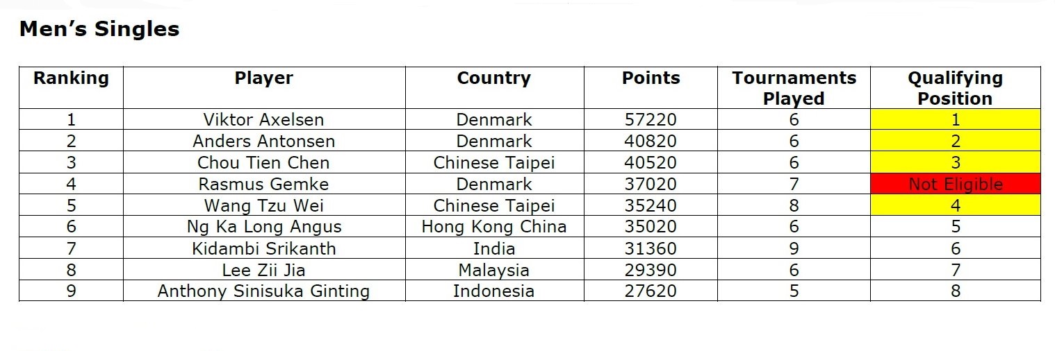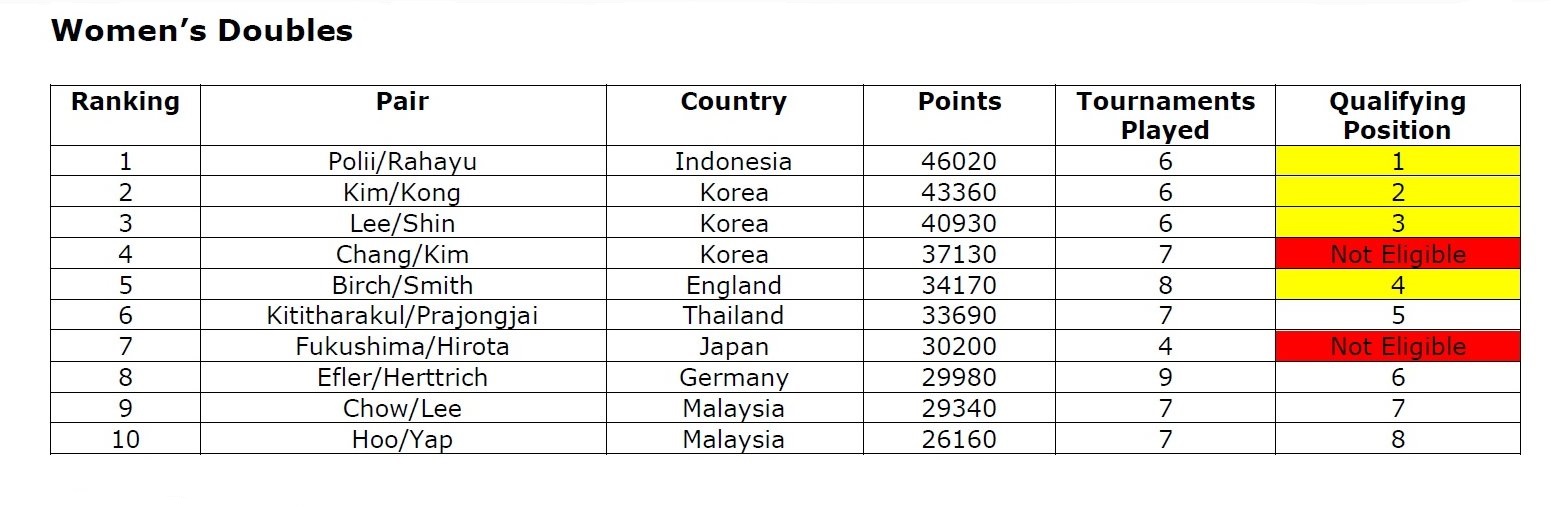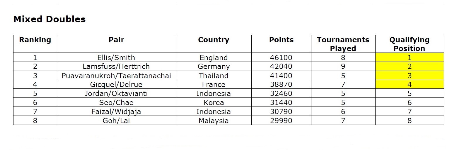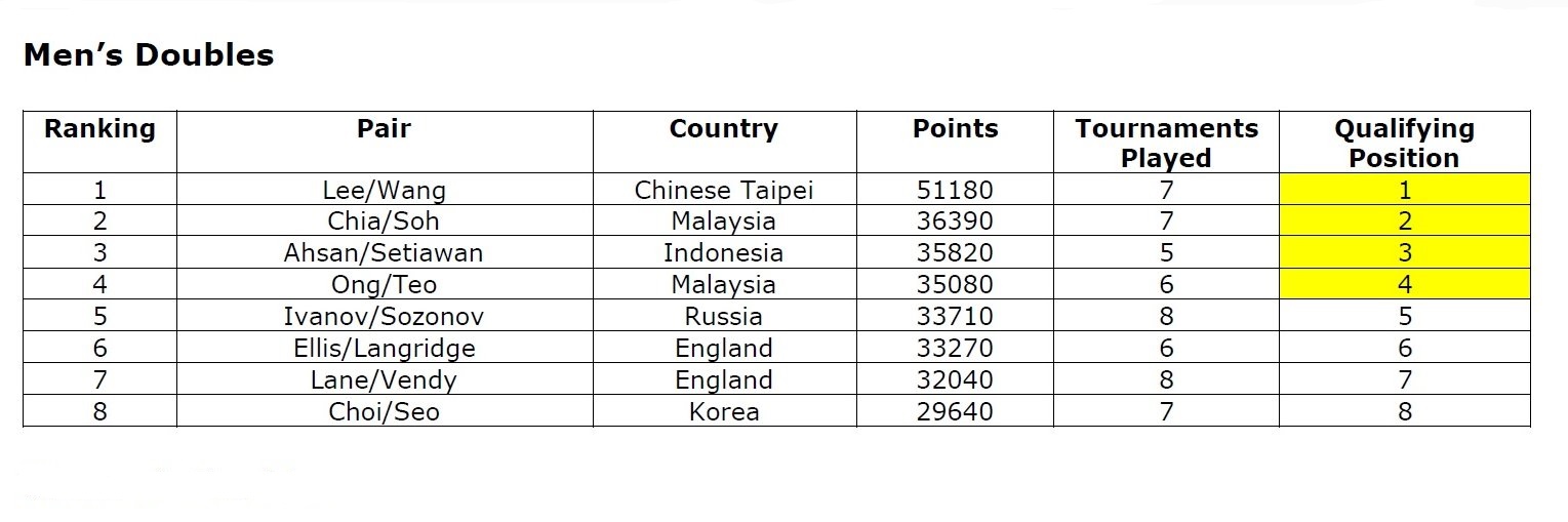 Światowa Federacja Badmintona (BWF) ogłosiła listę zakwalifikowanych do finałów... zeszłorocznego cyklu turniejów HSBC BWF World Tour. Z powodu pandemii COVID-19 cykl dokończono w styczniu 2021 roku dwoma turniejami najwyższej rangi Super 1000: (Yonex) Thailand Open I i (Toyota) Thailand Open II, a ukoronowaniem będą właśnie rozpoczynające się w najbliższą środę HSBC BWF World Tour Finals — tradycyjna impreza w formule turnieju mistrzów.