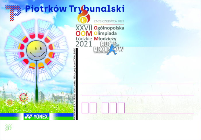 Projekt autorstwa artysty plastyka Adama Kowalewskiego. Kartkę otrzyma każdy uczestnik Olimpiady, a niezależnie od tego będzie ją można nabyć w Urzędzie Pocztowym Piotrków Trybunalski 1 od najbliższego poniedziałku. 27. Ogólnopolska Olimpiada Młodzieży w badmintonie (mistrzostwa Polski juniorów młodszych — U17). 27-29 czerwca 2021. Piotrków Trybunalski. Hala OSiR Relax, ul. Stefana Batorego 8. Wyniki w serwisie tournamentsofware.com. Janusz Łojek |