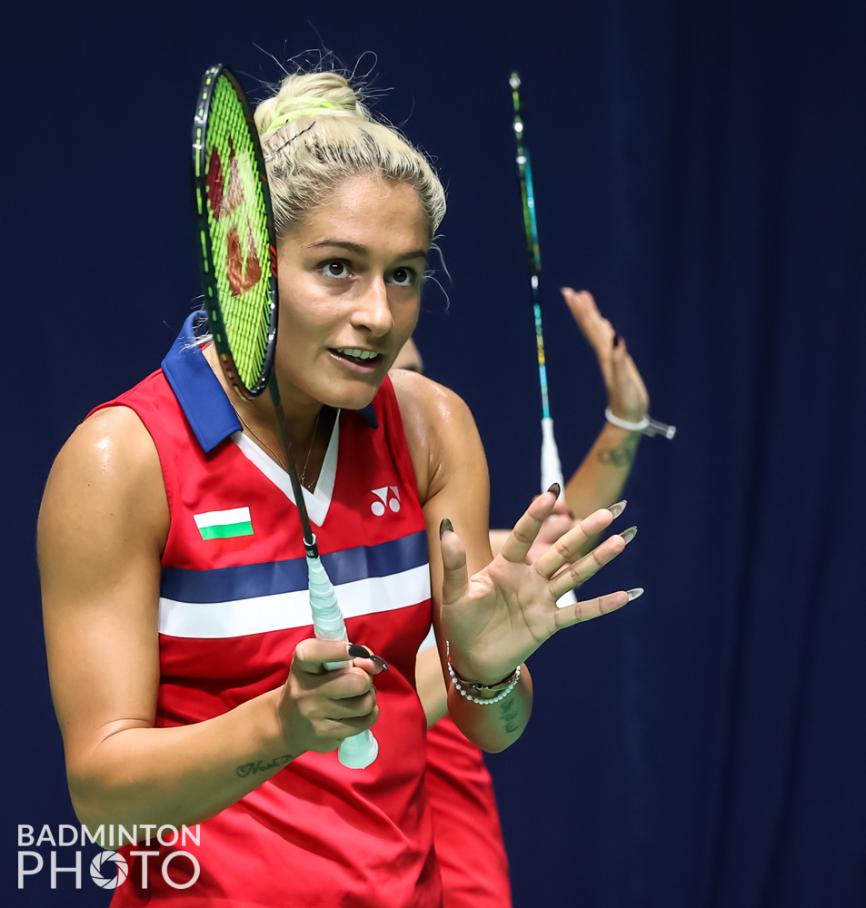 Aktualne mistrzynie Europy w grze podwójnej, siostry Gabriela i Stefani Stojewe (na fot. 1 na pierwszym planie Gabriela), awansowały do ćwierćfinału otwartych mistrzostw Francji w badmintonie (Yonex French Open 2021 HSBC BWF World Tour Super 750, 600 tys. dol.). Bułgarki pokonały duńską parę Alexandra Bøje, Mette Poulsen 25:23 23:21.