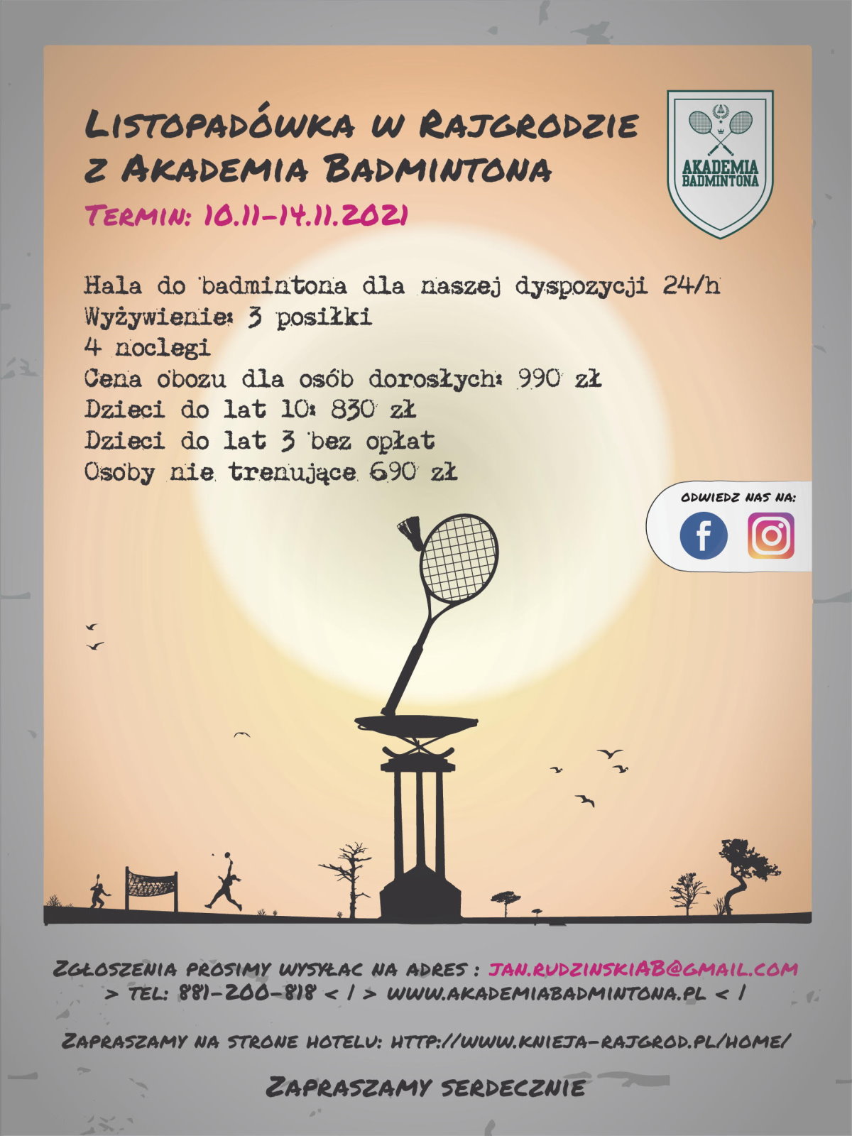 Zaczynamy zapisy na naszą czterodniową listopadówkę w Rajgrodzie. W tym roku pojedziemy razem z grupą z Olsztyna na wspólne trenowanie:) Planujemy dużo treningów badmintona, gier oraz turniej!