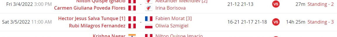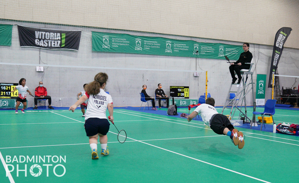 Ostatecznie minimalnie lepszy okazał się mikst z Peru, awansując do finału kategorii SH 6. Mecz ten mógłby się zapisać w kronikach światowego parabadmintona, gdyby widoczny w serwisie bwfpara,tournamentsoftware.com czas rozgrywki (14 godzin 25 minut) był prawdziwy. Brązowy medal zdobył także debel Daria Bujnicka, Oliwia Szmigiel. Zob. album zdjęć z 3.03.2022 na Badzine Poland. Międzynarodowe mistrzostwa Hiszpanii w parabadmintonie (II). 1-6 marca 2022. Spanish Para Badminton International II 2022. Vitoria (Hiszpania). Kategoria: BWF Para Badminton International Level 2. Losowanie i wyniki w serwisie bwfpara.tournamentsoftware.com. Fot. Alan Spink © BadmintonPhoto.com (live) jr |