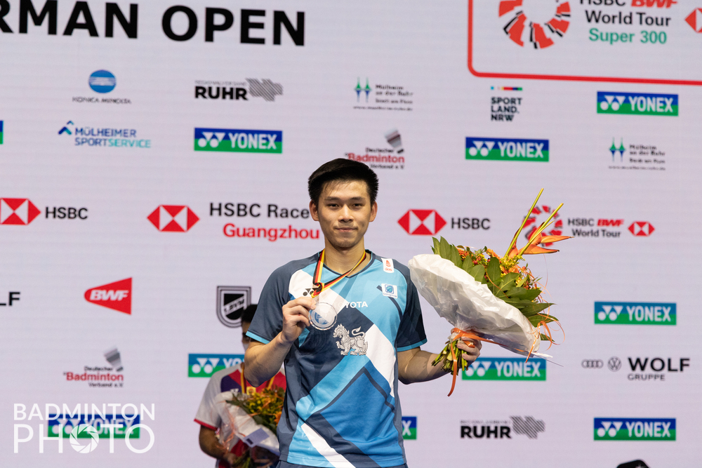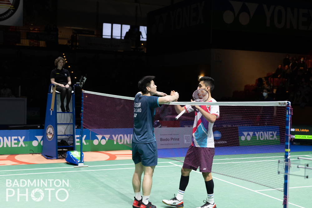 Tajlandczyk Kunlavut Vitidsarn i Hindus Lakshya Sen (fot. 1) w finale otwartych mistrzostw Niemiec w badmintonie (YONEX GAINWARD German Open 2022 HSBC BWF World Tour Super 300) zagrali na niemal identyczny wynik jak w finale Polish Open (Częstochowa, 2019). (fot. 2). Tak jak wtedy wygrał Tajlandczyk (fot. 2).