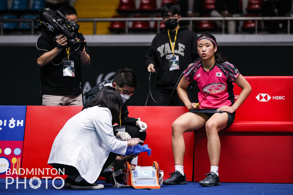 Koreańska dwudziestolatka An Se Young (4. BWF) nie oszczędzała kolan i wymagała pomocy lekarskiej (fot. 2-3), ale potwierdziła swoją wyższość nad Japonką Saeną Kawakami (45. BWF), z którą przegrała w Japonii jako nastolatka. Teraz role się odwróciły i zwycięstwo bezdyskusyjnie przypadło reprezentantce gospodarzy — 21:14 21:7. W finale singla mogą się spotkać dwie Koreanki. Wspomniana An Se Young będzie w półfinale faworytką w pojedynku ze słynną Pusarlą Venkatą Sindhu (Indie). Hinduska notorycznie nie radzi sobie z Koreanką, przegrywała z nią zawsze, nie potrafiąc nawet wygrać seta. W drugim półfinale szanse ma Kim Ga Eun, choć jej rywalka, Pornpawee Chochuwong (Tajlandia) jest nieco wyżej w rankingu. Obie są w wysokiej formie, Kim ma lepszy bilans head-to-head (2:0), ale dawno ze sobą nie grały. Zob. też: Kolejna sensacja w Korea Open Otwarte mistrzostwa Korei w badmintonie. Korea Open Badminton Championships. 5-10 kwietnia 2022. Suncheon (Korea). Palma Stadium. HSBC BWF Tour Super 500. Pula nagród: 360 tys. dol. Wyniki w serwisie tournamentsofware.com. Fot. Erika Sawauchi © BadmintonPhoto.com (live) jr |