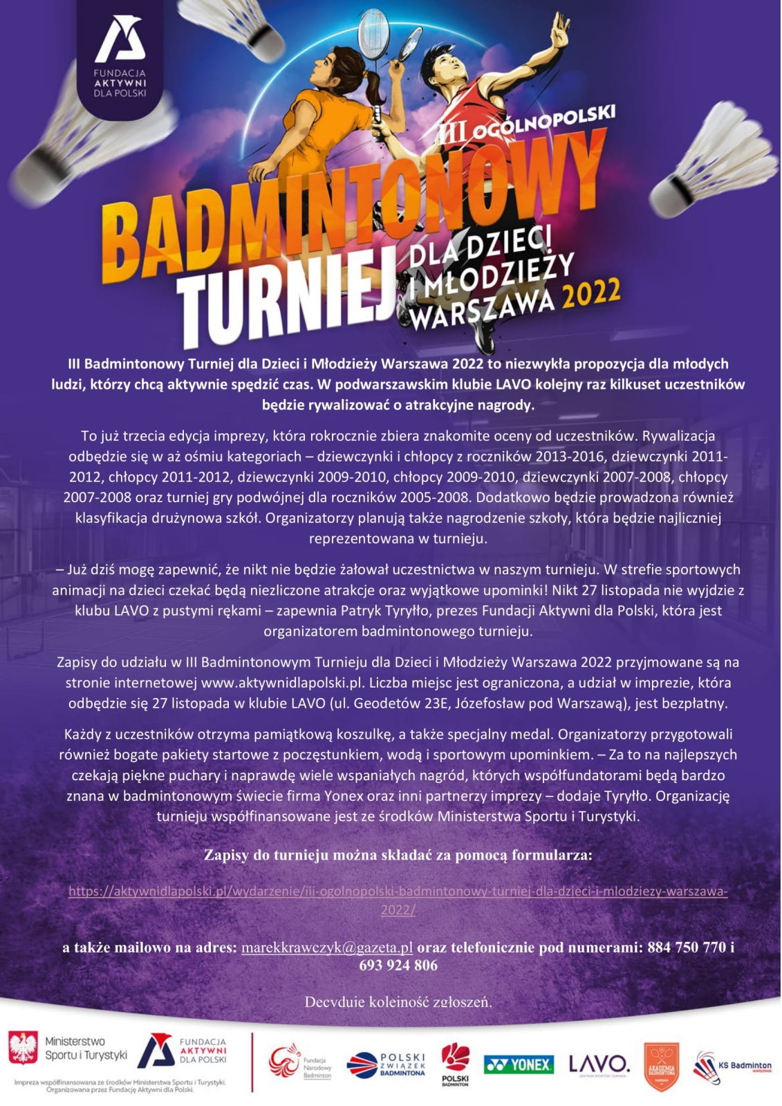 III Badmintonowy Turniej dla Dzieci i Młodzieży Warszawa 2022 to niezwykła propozycja dla młodych ludzi, którzy chcą aktywnie spędzić czas. W podwarszawskim klubie LAVO kolejny raz kilkuset uczestników będzie rywalizować o atrakcyjne nagrody.