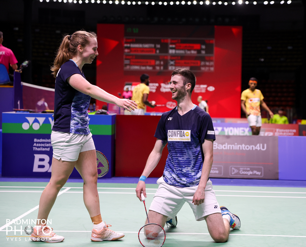 Szkoccy miksiści, Julie Macpherson i Adam Hall (fot. 1), sensacyjnie tryumfują w pierwszej rundzie otwartych mistrzostw Tajlandii w badmintonie (TOYOTA GAZOO RACING Thailand Open 2023 HSBC BWF World Tour Super 500). Para sklasyfikowana na 37. miejscu listy światowej wyeliminowała w niecałą godzinę wicemistrzów tegorocznych otwartych mistrzostw Anglii w badmintonie, numer cztery rankingu BWF, Chae Yu Jung i Seo Seung Jae (Korea) 21:14 16:21 21:18.
