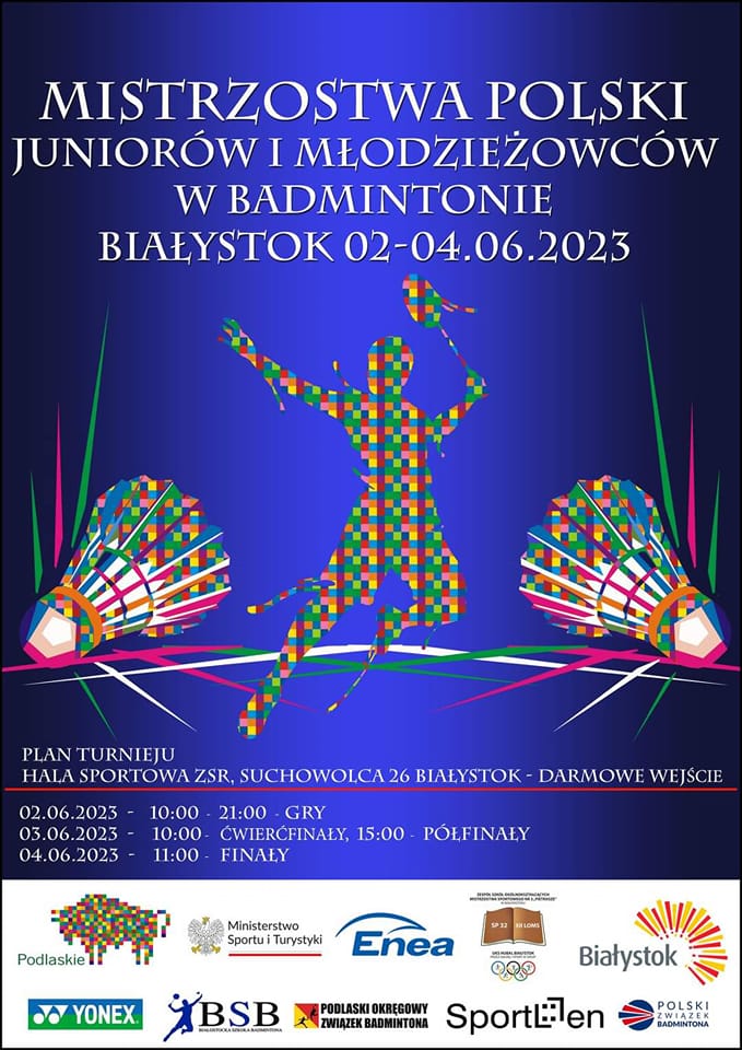 Partnerzy Mistrzostw Polski Juniorów i Młodzieżowców: Miasto Białystok, Województwo Podlaskie, Enea S.A., Yonex Polska. Organizatorzy i współorganizatorzy turnieju: Podlaski Okręgowy Związek Badmintona, Polski Związek Badmintona, Białostocka Szkoła Badmintona, Sportlen. mat. Organizatora |