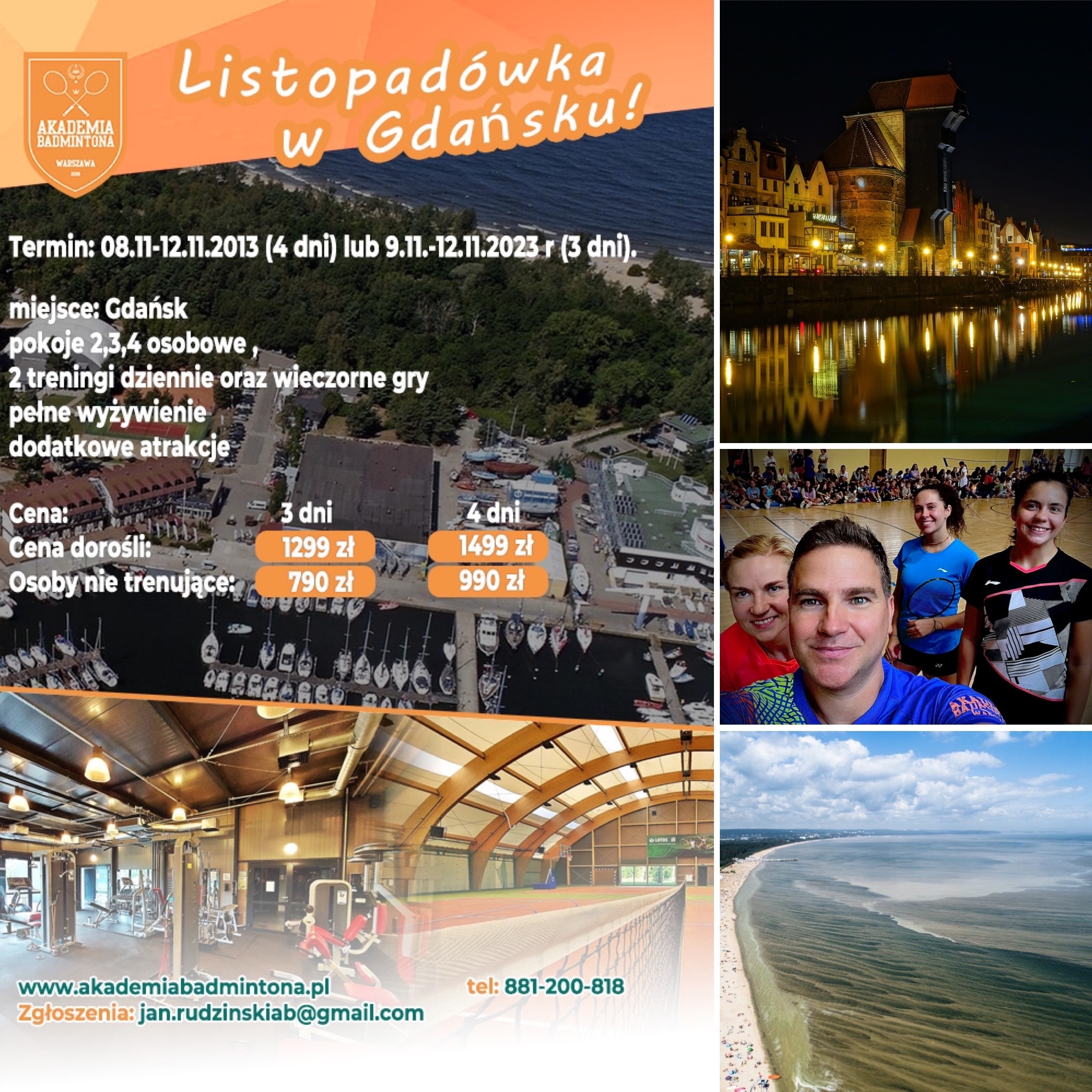 Akademia Badmintona Warszawa zaprasza na obóz listopadowy w Gdańsku w terminie 8.11-12.11.2013 (4 dni) lub 9.11-12.11.2023 (3 dni), prowadzony przez duet szkoleniowy w składzie: Nadia Zięba, mistrzyni Europy oraz nr 1 na świecie, Karolina Władzińska, medalistka Akademickich Mistrzostw Europy, 3. singlistka w Polsce.