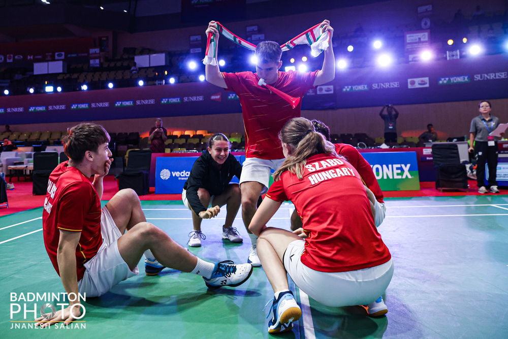 Potem niestety wszystko wróciło do normy i przegraliśmy z faworytami grupy eliminacyjnej G wysoko. Polacy w spotkaniu z Koreą wystąpili w składzie: Wiktoria Kaletka, Paweł Kiszczyk, Mikołaj Morawski, Damian Perkowski, Sebastian Pinkowicz, Krzysztof Podkowiński, Bartosz Puńko, Olga Szwarnowiecka i Kaja Ziółkowska. Jednak dla dalszych losów Biało-Czerwonych w mistrzostwach realne znaczenie miało inne spotkanie grupowe, bez naszego udziału. Zwycięstwo Rumunii nad Węgrami oznaczałoby zajęcie przez Polaków trzeciego miejsca w grupie, czyli znacznie poniżej ambicji drużyny. Polska pokonała wcześniej Węgry 2:0 (choć nie było łatwo) i przegrała minimalnie z Rumunią 1:2. Spotkanie obu rywalizujących z nami w grupie drużyn potoczyło się poniekąd podobnie do batalii Polski z Rumunią, ale tym razem w roli Rumunów wystąpili Węgrzy (fot. 2), a Rumuni wcielili się w skórę Biało-Czerwonych, bo podobnie jak oni w starciu z Rumunią wygrali pierwszą partię, przegrali drugą, a w trzeciej zaprzepaścili zwycięstwo mimo prowadzenia. Węgrzy w trzeciej, decydującej partii, przegrywali, ale strata była tylko kilkupunktowa i ją cierpliwie odrabiali. Zabójczy cios na ostatniej zmianie sztafety zadał Rumunom węgierski debel męski, dając drużynie zwycięstwo 45:44! Polska zajęła drugie miejsce w grupie G i zagra o lokaty 9-16. Na poprzednich mistrzostwach zajęliśmy 12. miejsce. 21. mistrzostwa świata drużyn mieszanych juniorów (U-19) w badmintonie — Suhandinata Cup (YONEX SUNRISE BWF World Junior Mixed Team Championships 2025). 6 — 11 października 2025. Guwahati, Assam (Indie). National Centre of Excellence. Kategoria: Grade 1 – Junior Team Tournament. Wyniki w serwisie tournamentsoftware.com. Fot. Jnanesh Salian © BadmintonPhoto.com (live) jr |