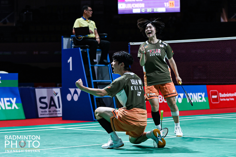 W półfinale koreańska para, rozstawiona z numerem dwa pokonała chiński mikst rozstawiony z numerem cztery, Chen Jun Ting, Cao Zi Han 15:6 16:14. Koreańczyków miała przyjemność poznać w fazie grupowej drużynowego czempionatu juniorów polska para mieszana, Mikołaj Morawski, Kaja Ziółkowska, której bilans, wówczas w sztafecie, przeciwko mikstowi z Korei wyniósł najpierw 3:10 (drużyna Korei odebrała wtedy Polakom prowadzenie wywalczone przez Sebastiana Pinkowicza) i — w drugim secie — 2:9. W finale Lee i Cheon zmierzą się z tajwańskim mikstem Hung Bing Fu, Chou Yun An, który w półfinale pokonał rozstawionych z numerem jeden Malezyjczyków. Wyniki półfinałów (18.10.2025) Gra pojedyncza mężczyzn Moh. Zaki UBAIDILLAH (Indonezja, 1) — LI Zhi Hang (Chiny) 14:16 16:14 15:12; LIU Yang Ming Yu (Chiny, 3) — Richie Duta RICHARDO (Indonezja, 2) 15:7 10:15 15:13. Gra pojedyncza kobiet Tanvi SHARMA (Indie, 1) — LIU Si Ya (Chiny) 15:11 15:9; Anyapat PHICHITPREECHASAK (Tajlandia, 2) — Yataweemin KETKLIENG (Tajlandia, 6) 10:15 15:11 15:5. Gra podwójna mężczyzn CHO Hyeong Woo, LEE Hyeong Woo (Korea, 3) — Kazuma KAWANO, Shuji SAWADA (Japonia, 1) 13:15 15:11 15:8; CHEN Jun Ting, LIU Jun Rong (Chiny, 4) — Alexius Ongkytama SUBAGIO, Aquino Evano Keneddy TANGKA (Indonezja, 2) 15:6 15:6. Gra podwójna kobiet TAN Ke Xuan, WEI Yue Yue (Chiny, 1) — Kodchaporn CHAICHANA, Pannawee POLYIAM (Tajlandia, 1) 17:15 11:15 15:10; Zi Yu LOW, Noraqilah MAISARAH (Malezja, 3) — CAO Zi Han, CHEN Fan Shu Tian (Chiny, 8) 15:13 12:15 15:7. Gra mieszana HUNG Bing Fu, CHOU Yun An (Tajpej) — LOH Ziheng, Noraqilah MAISARAH (Malezja, 1) 13:15 15:12 15:8; LEE Hyeong Woo, CHEON Hye In (Korea, 2) — CHEN Jun Ting, CAO Zi Han (Chiny, 4) 15:6 16:14. Zob. też: Medale tylko dla juniorów z Azji Podkowiński i Morawski wylądowali na 9. miejscu w MŚ Morawski i Podkowiński w najlepszej „16” MŚ Biało-Czerwoni wykruszyli się — już niemal wszyscy Indywidualne mistrzostwa świata juniorów (U-19) w badmintonie (Eye-Level Cups — YONEX SUNRISE BWF World Junior Championships 2025). 13 — 19 października 2025. Guwahati, Assam (Indie). National Centre of Excellence. Kategoria: Grade 1 — Junior Tournament. Wyniki w serwisie BWF. Fot. Jnanesh Salian © BadmintonPhoto.com (live) jr |
