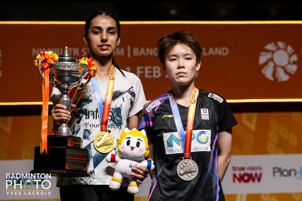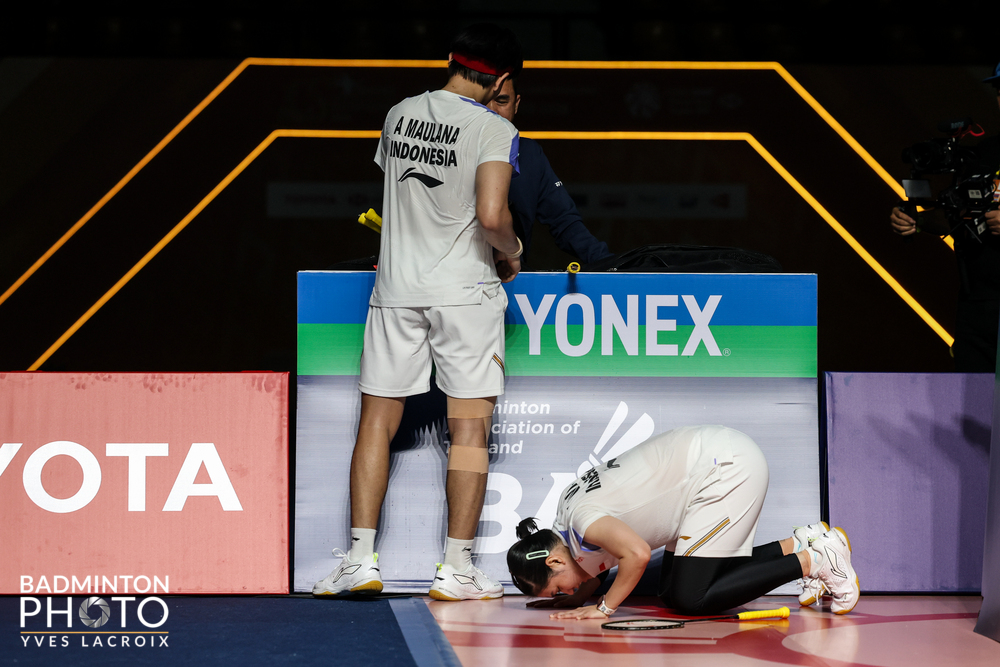 To oczywiście najwyższej rangi tytuł zdobyty przez indonezyjskiego juniora (na fot. 2 na podium towarzyszy mu trener Indra Widjaja), zajmującego w tej chwili 44. miejsce na liście światowej. Na trofeum polował również jego finałowy rywal, który zajmuje 36. pozycję w rankingu, a na razie wygrał zawody World Tour Super 100 (tydzień temu przegrał z innym Indonezyjczykiem finał Super 500 w Dżakarcie), wcześniej był w półfinale mistrzostw świata juniorów. Tajlandczyk osiągał w każdym z trzech setów pojedynku finałowego sporą przewagę, ale jedynie w drugiej partii zdołał jej nie roztrwonić. Finał singla kobiet potwierdził osłabienie trudami turnieju Malezyjki Goh Jin Wei. Po klęsce w pierwszym secie przeciwko Device Sihag (fot. 3) z Indii próbowała ambitnie podnieść się w drugim, ale skapitulowała przy stanie 3:6. Powodem było wyczerpanie organizmu badmintonistki. Goh Jin Wei zdobyła dwukrotnie mistrzostwo świata juniorek, ale potem musiała się poddać hemikolektomii (2019), zakończyła karierę, ale wróciła na korty mimo niepełnego zdrowia. Devika Sihag (63. BWF) zdobyła w Bangkoku swój pierwszy tytuł w World Tourze. Natomiast Goh Jin Wei przybyła do Bangkoku w mało obiecujacym momencie kariery. Jej poprzedni występ zakończył się odpadnięciem w pierwszej rundzie Korea Masters w październiku 2025. Nie zapowiadało to niczego dobrego w Thailand Masters, ale zebrała siły i w pierwszej rundzie pokonała tajwańską badmintonistkę (numer 53 na świecie) Huang Ching Ping 21:18 21:23 21:11. Następnie popisała się comebackiem przeciwko Chince Han Qian Xi, singlistce zajmującej 37. miejsce w światowym rankingu, wygrywając 12:21 21:10 21:16, po czym ponownie stoczyła zaciętą walkę, pokonując w ćwierćfinale Karupathevan Letshanaę (Malezja), zajmującą 38. miejsce w światowym rankingu, w stosunku 12:21 21:17 21:19. A jej sobotnie zwycięstwo w półfinale było prawdopodobnie najtrudniejsze, ponieważ Jin Wei odrobiła stratę 12:16 w drugim secie po przegraniu pierwszego przeciwko Wong Ling Ching (mecz wygrała 17:21 21:17 21:16) i została pierwszą malezyjską singlistką, która dotarła do finału Super 300. Sihag zarobiła za zwycięstwo 18 750 dolarów, a Jin Wei — 9500 dolarów. Pozostałe finały to tryumf Indonezji: w deblu mężczyzn był niezagrożony, bo grały ze sobą dwie pary z tego kraju, zresztą rozstawione z numerami jeden i dwa. Zwyciężyli ci pierwsi, Leo Rolly Carnando i Bagas Maulana (fot. 4), pokonując młodych rodaków Raymonda Indrę i Nikolausa Joaquina 21:10 21:17. Carnando i Maulana byli trochę wyposzczeni, bo nie zdobyli żadnego tytułu mistrzowskiego od Korea Open we wrześniu zeszłego roku. Chyba dlatego ten pierwszy po zdobyciu decydującego punktu w finale odreagował napięcie, roztrzaskując rakietę. W finale miksta rozstawieni z numerem sześć Adnan Maulana i Indah Cahya Sari Jamil (fot. 5) pokonali swoich nierozstawionych rodaków Bobby'ego Setiabudiego i Melati Daevę Oktavianti 18:21 21:19 21:17. Natomiast finał debla kobiet stanowił jedyną szansę dla Chin na tytuł. Jednak po 1,5-godzinnej batalii rozstawione z numerem osiem Amallia Cahaya Pratiwi i Siti Fadia Silva Ramadhanti (fot. 6, Indonezja) pokonały chińską parę Bao Li Jing, Li Yi Jing. Tym samym Chiny sensacyjnie nie zdołały nikogo wprowadzić na najwyższy stopień podium w tym turnieju. Wyniki finałów (1.02.2026) Singel mężczyzn Moh. Zaki UBAIDILLAH (Indonezja) — Panitchaphon TEERARATSAKUL (Tajlandia) 21:19 20:22 21:19 (1:18). Devika SIHAG (Indie) — GOH Jin Wei (Malezja) 21:8 6:3 (0:17). Debel mężczyzn Leo Rolly CARNANDO, Bagas MAULANA (Indonezja, 1) — Raymond INDRA, Nikolaus JOAQUIN (Indonezja, 2) 21:10 21:17 (0:35). Debel kobiet Amallia Cahaya PRATIWI, Siti Fadia Silva RAMADHANTI (Indonezja, 8) — BAO Li Jing, LI Yi Jing (Chiny, 7) 15:21 21:15 21:18 (1:30). Mikst Adnan MAULANA, Indah Cahya Sari JAMIL (Indonezja, 6) — Bobby SETIABUDI, Melati Daeva OKTAVIANTI (Indonezja) 18:21 21:19 21:17 (1:02). Zob. też: Urodzinowa seria Goh Jin Wei Czy Alwi Farhan wygra drugi turniej z rzędu? Przedwczesny finał w singlu mężczyzn? Legionistka (b. unionistka) postraszyła Chinkę Turniej badmintona PRINCESS SIRIVANNAVARI Thailand Masters 2026. 27 stycznia — 1 lutego 2026. Patumwan, Bangkok (Tajlandia). Nimibutr Stadium. Kategoria: HSBC BWF World Tour Super 300. Pula nagród: 250 tys. dol. Wyniki w serwisie BWF. Fot. Yves Lacroix © BadmintonPhoto.com (live) jr |