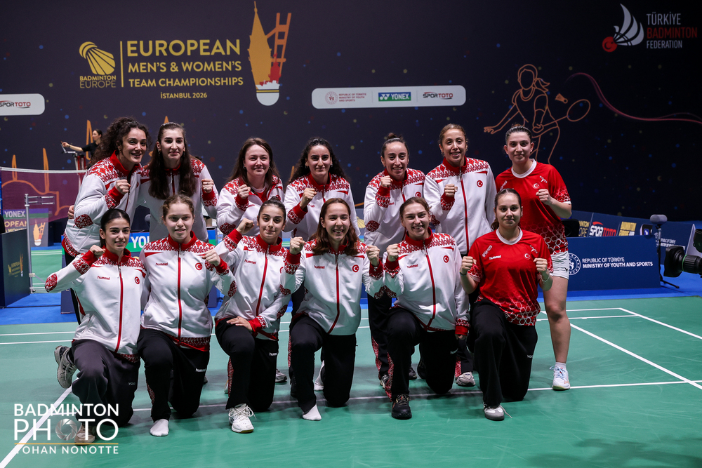 Dokładnie zaś chodzi o Ukrainki, które pokonały w piątek w ostatnim spotkaniu grupy eliminacyjnej Niemki 4:1. Na fot. 1 Polina Buhrowa, która w pojedynku pierwszych singlistek pokonała Mirandę Wilson 21:17 21:18. Także Szwecja ma swój pierwszy w dziejach medal na tym czempionacie. U nich to akurat zasługa mężczyzn. Szwedzi pokonali Niemców 3:2 (tam także niemiecka rakieta numer jeden, Mathias Kicklitz, okazała się gorsza od rywala, Gustava Bjorklera, przegrywając 25:27 16:21) i awansowali do półfinału. "Dwumecz" z gospodarzami rozegrała Francja. Francuzki przegraly z Turczynkami 2:3, a Francuzi rozgromili Turków bez straty seta. Zestawienie półfinałów Kobiety Dania (fot. 2) — Ukraina Bułgaria — Turcja (fot. 3) Mężczyźni Dania — Anglia Francja — Szwecja Mistrzostwa Europy drużyn męskich i żeńskich. 2026 European Men's & Women's Team Championships. 11 — 15 lutego 2026. Stambuł (Turcja). Başakşehir Spor Kompleksi. Wyniki w serwisie BWF. Fot. Raphaël Sachetat, Yohan Nonotte © BadmintonPhoto.com (live) jr |