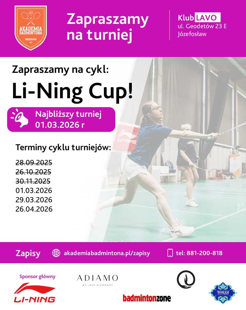 Zawody przeznaczone są dla amatorów i wyczynowców (w przypadku tych ostatnich chodzi o kategorie oznaczone jako SUPER). Li-Ning Cup vol. 4 rusza już w niedzielę 1 marca, w hali LAVO. w Józefosławiu pod Warszawą (ul. Geodetów 23 E). Kategorie Li-Ning Cup to: singiel mężczyzn SUPEROPEN, singiel mężczyzn open kat. A (zaawansowani), singiel mężczyzn open kat. B (średnio zaawansowani), singiel mężczyzn open kat. C (początkujący), singiel mężczyzn kategoria wiekowa 40+, singiel mężczyzn kategoria wiekowa 55+, singiel kobiet A (zaawansowane), singiel kobiet B (średnio zaawansowane), debel mężczyzn SUPEROPEN, debel mężczyzn open A (zaawansowani), debel mężczyzn open B (średnio zaawansowani), debel kobiet SUPER OPEN, debel kobiet A (zaawansowane), debel kobiet B (średnio zaawansowane) gra mieszana – Mikst SUPEROPEN gra mieszana – Mikst A (zaawansowani), gra mieszana – Mikst B (średnio zaawansowani), gra mieszana – Mikst C (początkujący) Zawodnik może startować maksymalnie w 2 kategoriach w danym turnieju. Nie można łączyć startu w kategoriach na poziomach SUPEROPEN, A, B i C w tej samej grze, czyli singlu albo deblu czy mikście. W danym turnieju zawodnik nie może np. grać jednocześnie w singlu SUPEROPEN i singlu A ani w mikście A i zarazem mikście B czy C. Może natomiast grać np. w singlu B i mikście A. W turnieju nie mogą brać udziału osoby startujące w ekstraklasie (Lotto Ekstraliga) w sezonach 2022/2023, 2023/2024, 2024/2025, 2025/2026 z wyjątkiem kategorii SUPEROPEN, w których mogą startować wszyscy bez ograniczeń, jeśli chodzi o poziom gry. Zapisy na najbliższy turniej do czwartku 26 lutego (godz. 16.00). Losowanie zostanie opublikowane do godz. 24.00 w piątek 27 lutego. Ramowy program: 9.00 – oficjalne otwarcie turnieju i rozpoczęcie rozgrywek według planu gier, 12.30 –13.30 – dekoracja medalistów porannych rozgrywek + loteria z nagrodami, 18.30 – 19.00 – dekoracja zwycięzców w pozostałych kategoriach, ok. 18.00 – zakończenie turnieju. Do rozegranie pozostały jeszcze turnieje: 1.03.2026 29.03.2026 26.04.2026 Rozgrywki do wygranych dwóch setów do 21 pkt. System grupowo-pucharowy, chyba że liczba grających mieści się w ramach jednej grupy (wówczas system "każdy z każdym"). Turniej będzie rozgrywany lotkami dostarczonymi przez uczestników. We wszystkich kategoriach oznaczonych jako A oraz w SUPEROPEN obowiązują lotki piórowe. W pozostałych kategoriach uczestnicy sami wybierają rodzaj lotki (kolejność wg listy klasyfikacyjnej PZBad). Sponsor główny: Li-Ning. Partnerzy zawodów: Adiamo, PanidaSpa, Restauracja Tehran, Adiamo, BadmintonZone. Mat. Organizatora |