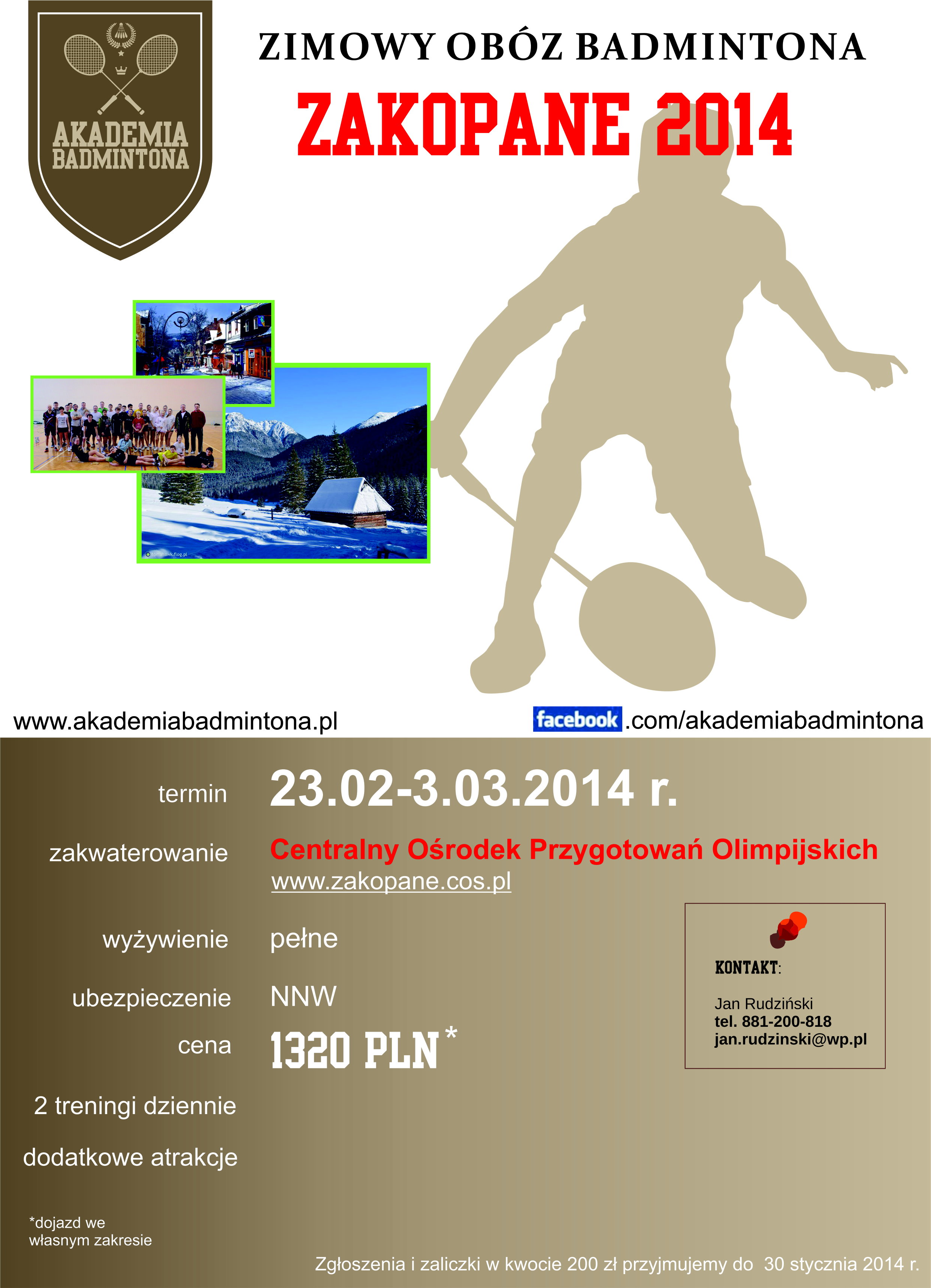 Na zimowy obóz w ośrodku przygotowań olimpijskich w Zakopanem (23.02–3.03.2014 r.) zaprasza "Akademia badmintona".