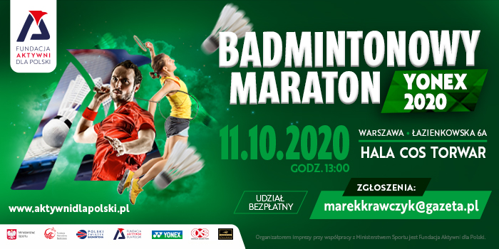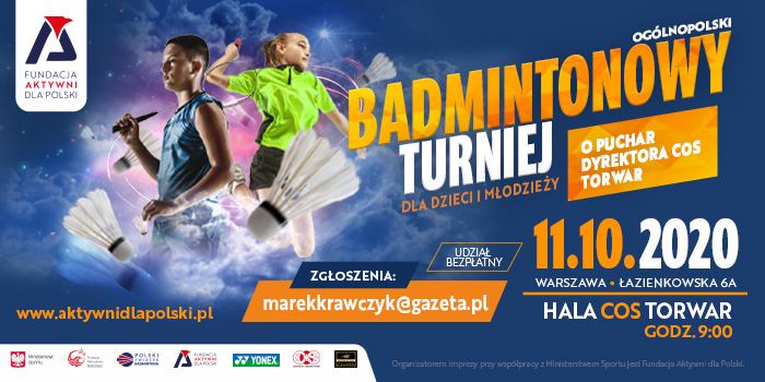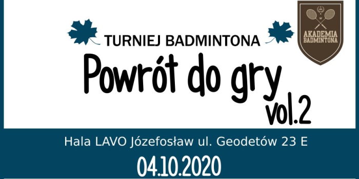 Akademia Badmintona zaprasza na drugi turniej z cyklu "Powrót do Gry"! Już 4.10.2020 (niedziela) można podjąć rywalizację turniejową. Organizatorzy przygotowali trochę niespodzianek. Utworzono w tym sezonie nową kategorię super open, w której mogąstartować wszyscy bez ograniczeń, oraz dodano singel kobiet B dla początkujących.